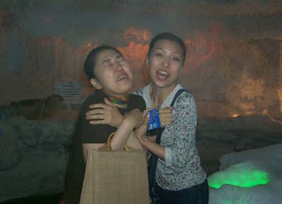 その日はとても暑かった。(特に、とても涼しいオレゴンから来た僕には。)そして僕は、“アイスワールド”と書かれたサインを見つけた。僕は、彼女達にそのチケットをおごることによってうまくおだてて、その奇妙なアトラクションに誘った。基本的に、それは5ドル払って、冷蔵庫の中を歩くようなものだ。それは世界でもっとも詐欺っぽい商売だったけど、すごくよかった!