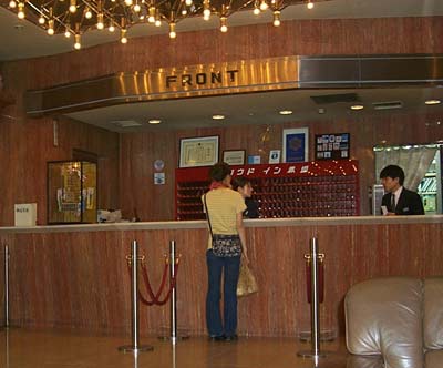 だけど、なんてこと!彼女はちょっとお金をけちって、シングルの部屋を予約して、こそこそっと二人で侵入して宿泊する予定にしてたんだけど、うまく実行できなかったんだ。僕は、彼女がどうにか僕も一緒に泊まれないか、フロントの人にお願いしてるときにこの写真を撮った。彼らはシングルの部屋に二人泊まることは許してくれなかった。しかも、亜希子がツイン分の料金を払うから、シングルの部屋に泊まらせてとお願いしてもだめだった。(シングルの部屋はお二人には狭すぎるから?という理由だった)このホテルは予約いっぱいで、