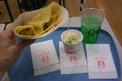 これはクレープタイプの食べ物(とてもおいしい!)と、メロンソーダ。僕は、アメリカでまだメロンソーダを見たことがない。でも僕は日本でこのメロンソーダ中毒になってしまった。いたるところで見かけたよ!