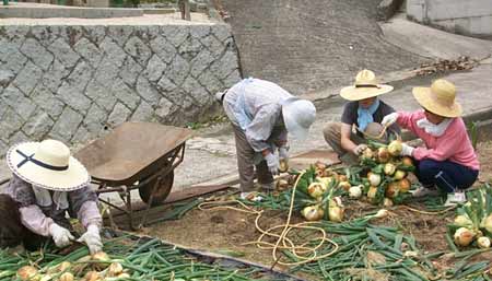 これは、たまねぎの収穫を手伝っているところ。この作業が終わったとき、僕はとても疲れていて、見てとれたようだ。おばあちゃんは僕に、“疲れた?”と聞いた。
