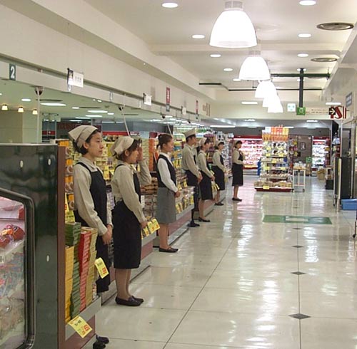見て、これはサービスなんだ。食料品売り場の売り子さんたちが、お客さんの入りを待っているところ。 (注:アメリカにはこんなに親切なサービスは死んでもありません。)