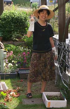 これは、お母さん(芳美さん)が、彼女のガーデンにいるところの写真。亜希子のご両親はとっても親切で、いろんなところへ車で連れて行ってくれた。ゲームセンターにまで連れていってもらった!でもお母さんに、ダンスダンスレボリューションを一緒にプレイしてもらうとこまでいかなかった!ぜひ次の機会に!!(^-^)