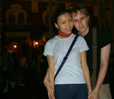 Us somewhere in Tokyo Disney. Every time I see a trash can the correct height I plop my digital camera on it and set the timer... I've gotten some strange shots... |
